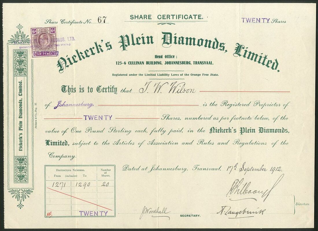 South Africa: Niekerk's Plein Diamonds Limited, £1 shares, Johannesburg [1912], #67, green, adhesive reveue stamp. VF and rare.
