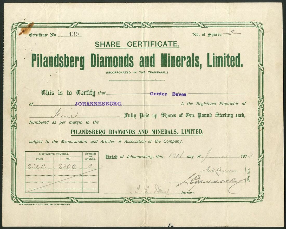 South Africa: Pilandsberg Diamonds and Minerals Ltd., £1 shares, Johannesburg 191[3], #439, green. Rusty pin mark at top left, AVF.