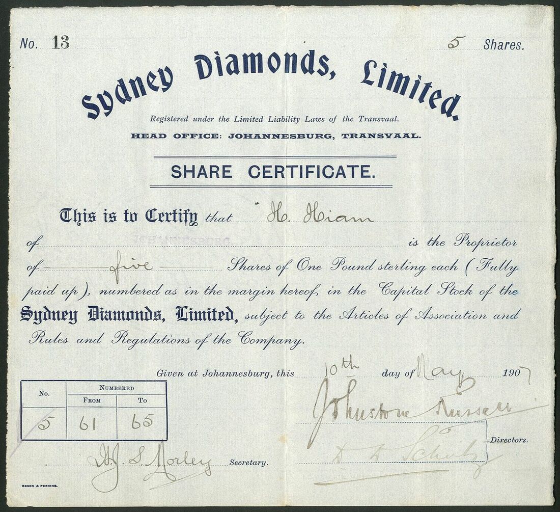 South Africa: Sydney Diamonds Limited, £1 shares, Johannesburg, 190[7], #13, blue on greyish paper. GVF and rare.