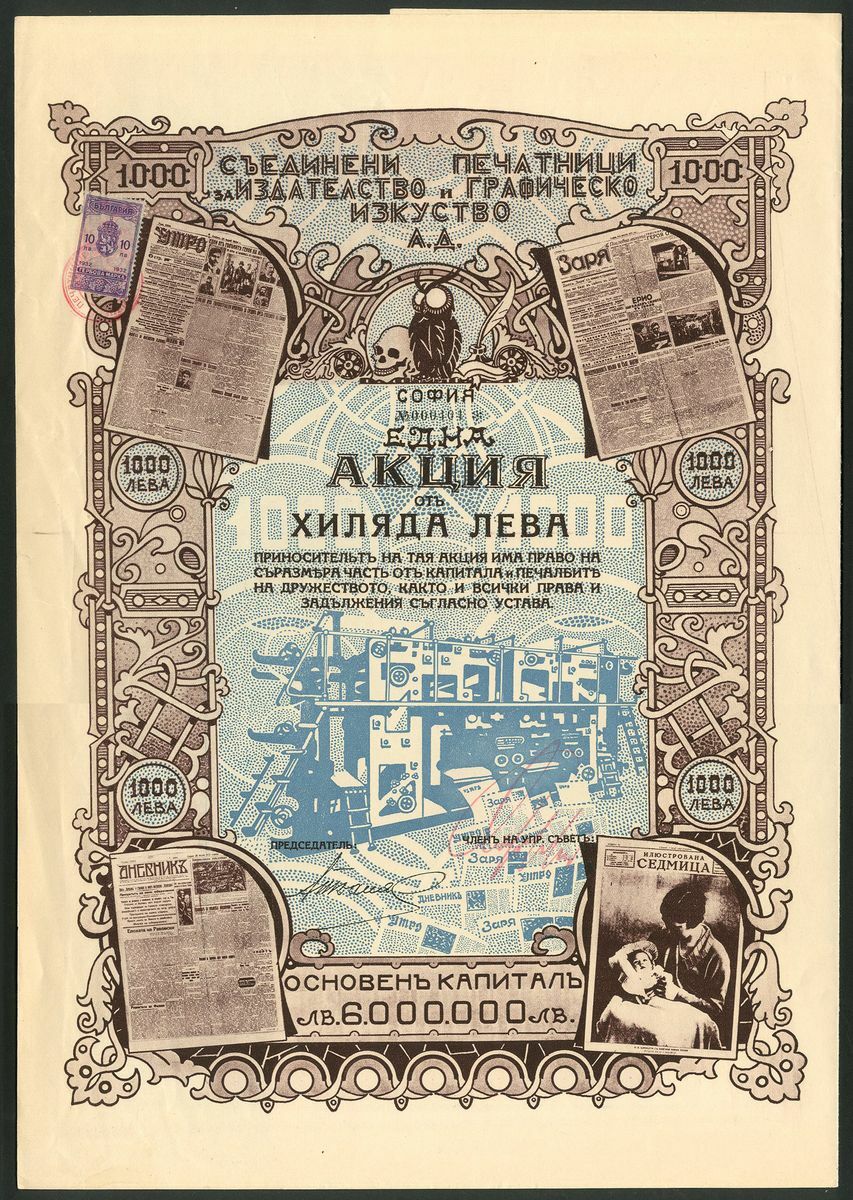 (x) Bulgaria: United Printing, Publishing and Graphic Art Company, 1000 leva share, circa 1922, #000404, large format piece with vignettes of newspapers and large printing press in underprint, text all cyrillic, ornate border, brown and blue, no coupons. EF.