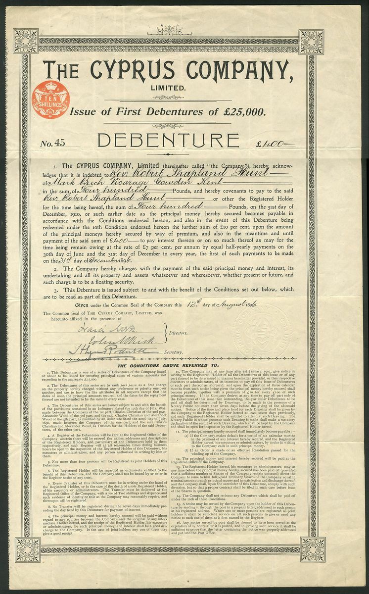 Cyprus: The Cyprus Company Limited, First Debenture for £[400], #45, large format, black. Set up by John William Williamson and Charles Christian in 1891 to operate Government contracts including a mine at Limni, near Polis and the eatern Mesaoria irrigation works. The founders were also heavily involved in the excavations being undertaken on the island by the British Museum, The company folded in 1897. AVF and rare.