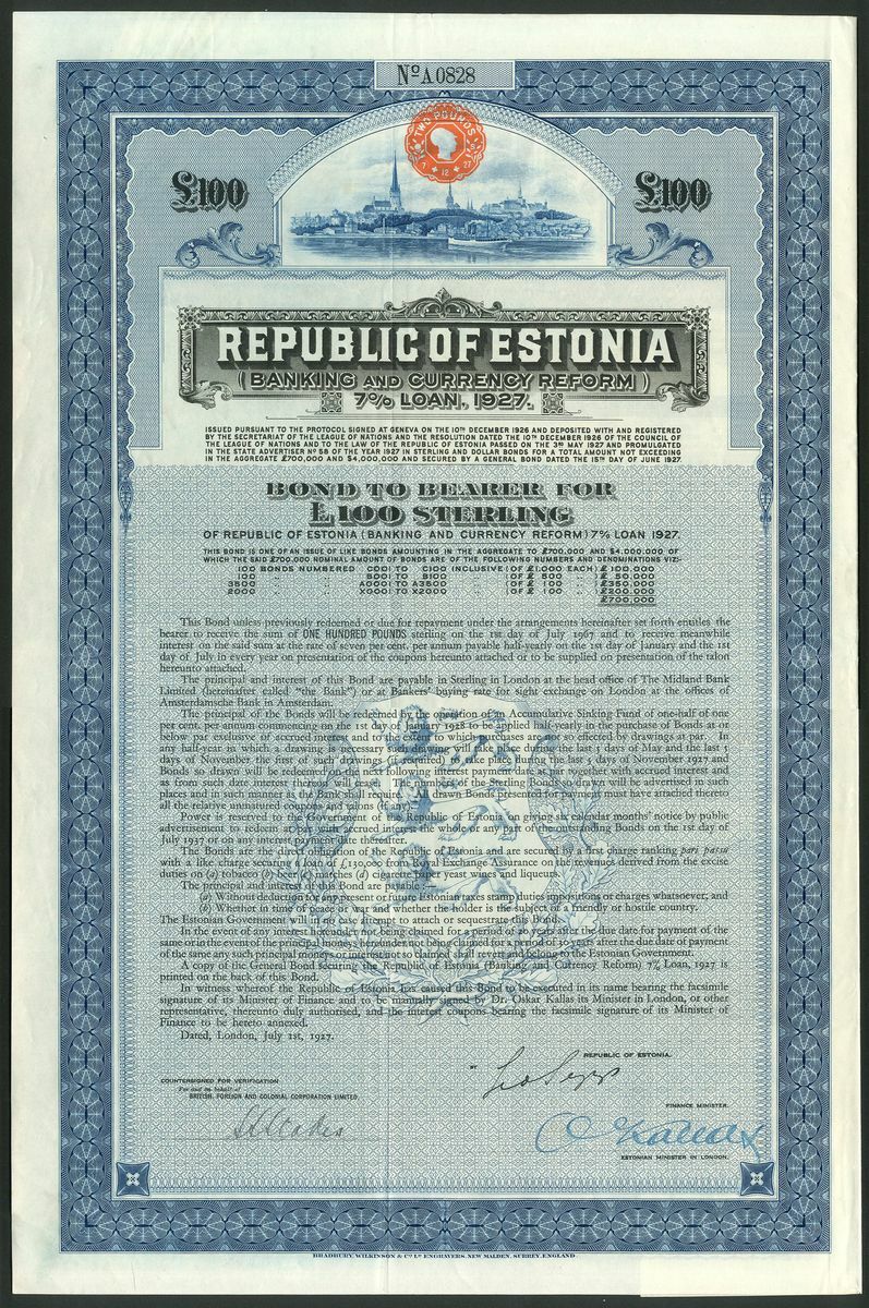 Estonia: 1927 7% (Banking and Currency Reform) Loan, bond for £100, #A0828, large format, vignette of city view at top, ornate borders, printed by Bradbury, Wilkinson & Co. Ltd., blue and black, with coupons. VF.