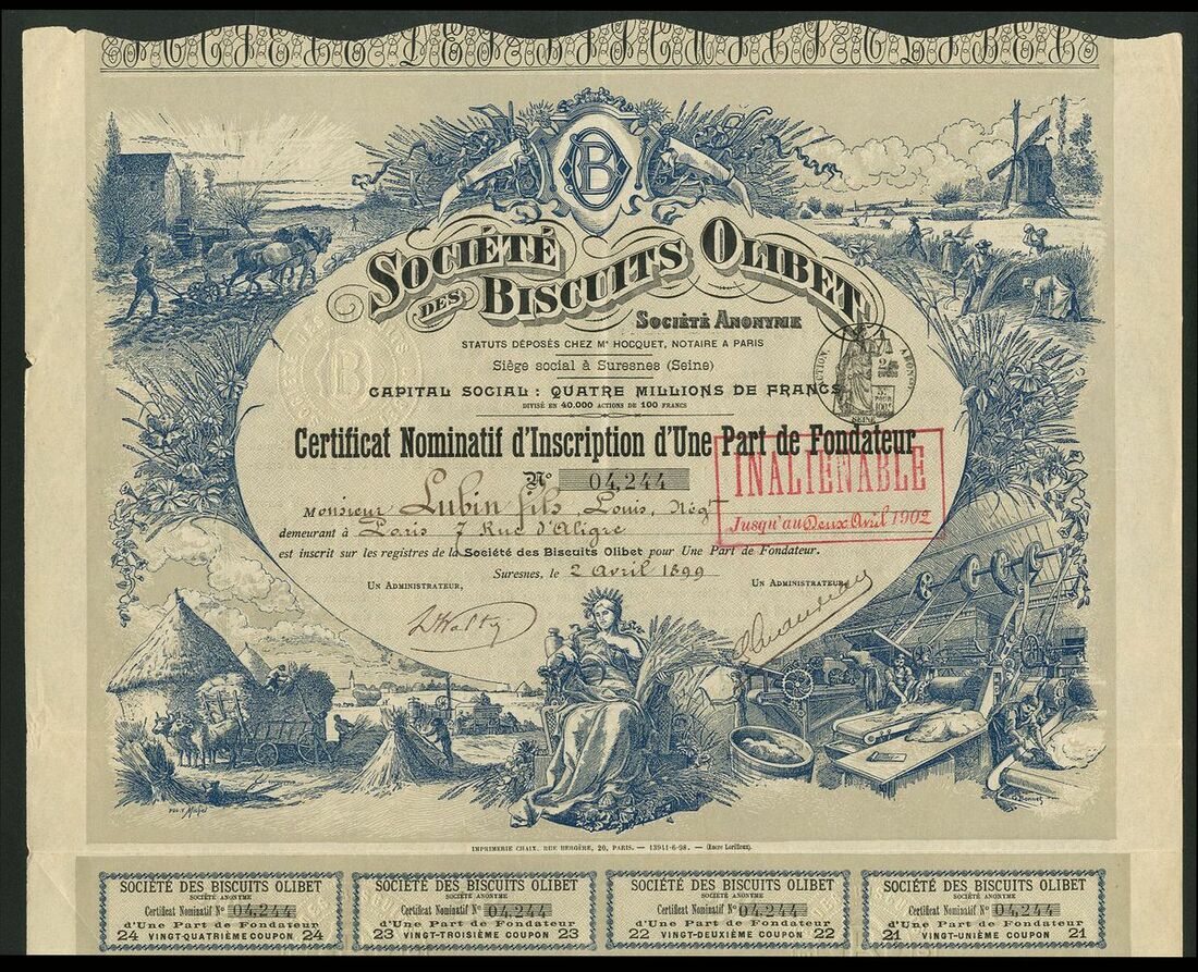 France: Société des Biscuits Olibet S.A., nominative certificate for 1 founders share, Suresnes [1899], #04244, very attractive piece with vignettes of ploughing, cutting and gathering wheat, and factory producing biscuits, blue, with coupons. A large concern started in Bordeaux in around 1860. Expanded into Paris in 1879 and Lyon in 1881. The Suresnes factory represented by this certificate was founded in 1880 and employed some 400 workers. Factory demolished in 1940. AEF. NO RESERVE
