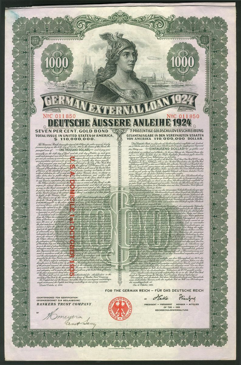 Germany: 1924 7% German External "Dawes" Loan, $1000 bond, #C011850, Germania at top, ornate border, text in English and German, green and black, pinkish underprint, with coupons, with U.S.A Domicile overprint in red. EF and NOT cancelled.