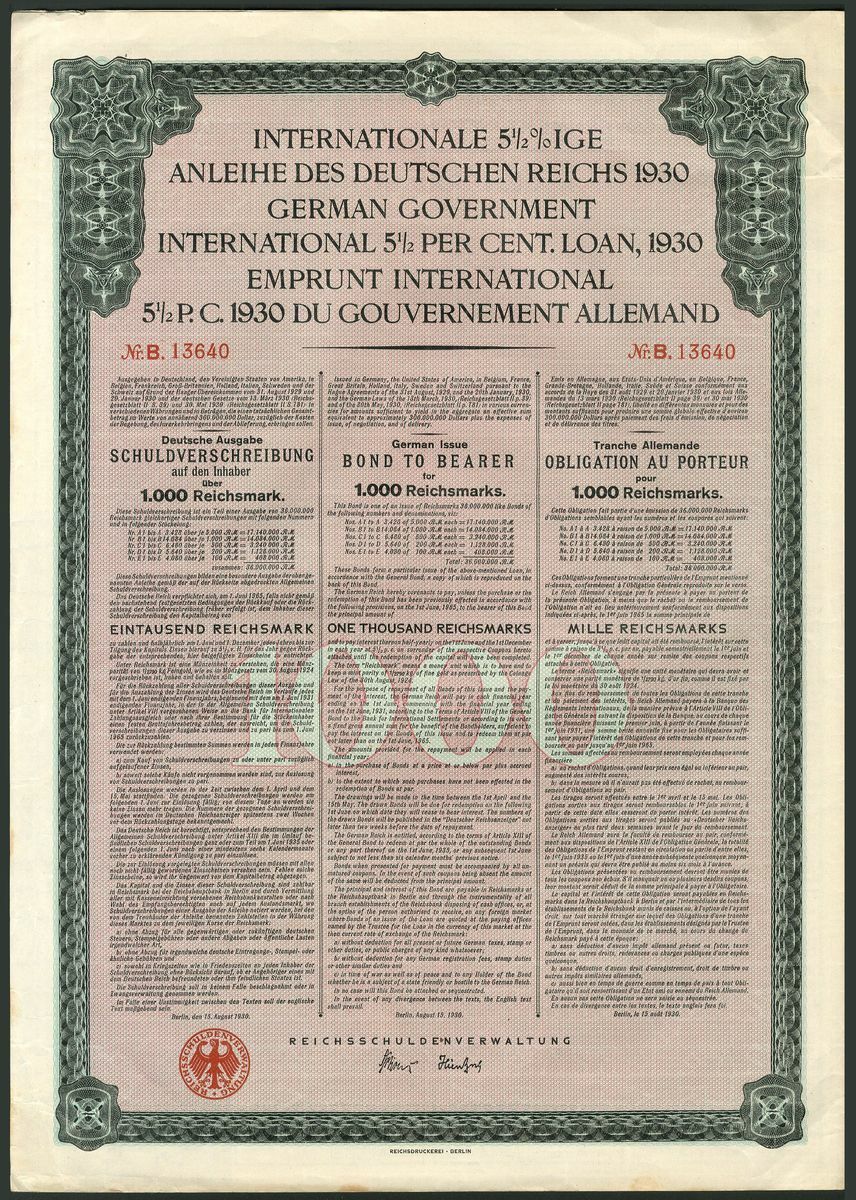 Germany: International 5½% "Young" Loan, 1930, German issue, bond for 1000 reichsmark, #B13640, ornate border, mauve and blue, text in English, German and French, with coupons, NOT cancelled. AEF and scarce