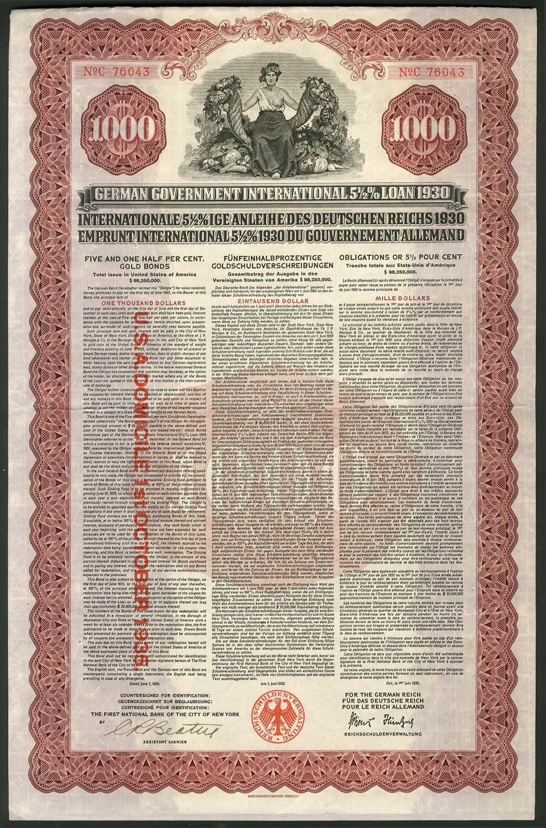 Germany: International 5½% "Young" Loan, 1930, bond for US$1000, allegorical female at top, ornate border, mauve and black, text in English, German and French, with coupons, with U.S.A Domicile red overprint, NOT cancelled. GVF.