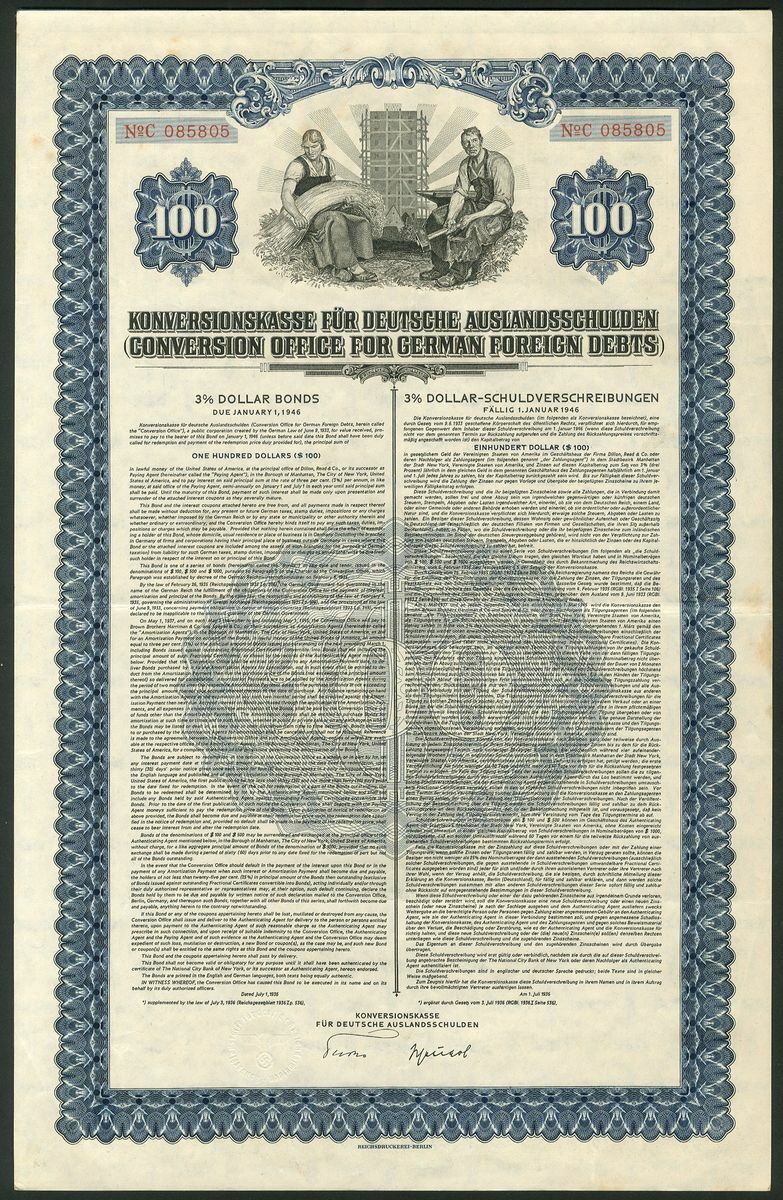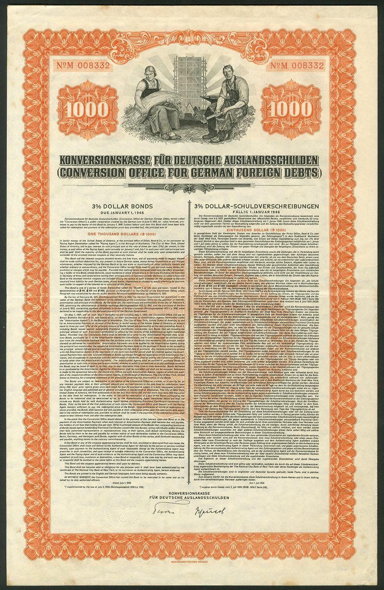 Germany: Konversionskasse fur Deutsche Auslandsschulden (Conversion Office for German Foreign Debts), a pair of 3% dollar bonds, 1936, $100 and $1000, workers flank a large block of flats, blue and orange respectively, with coupons, NOT CANCELLED. GVF (2).