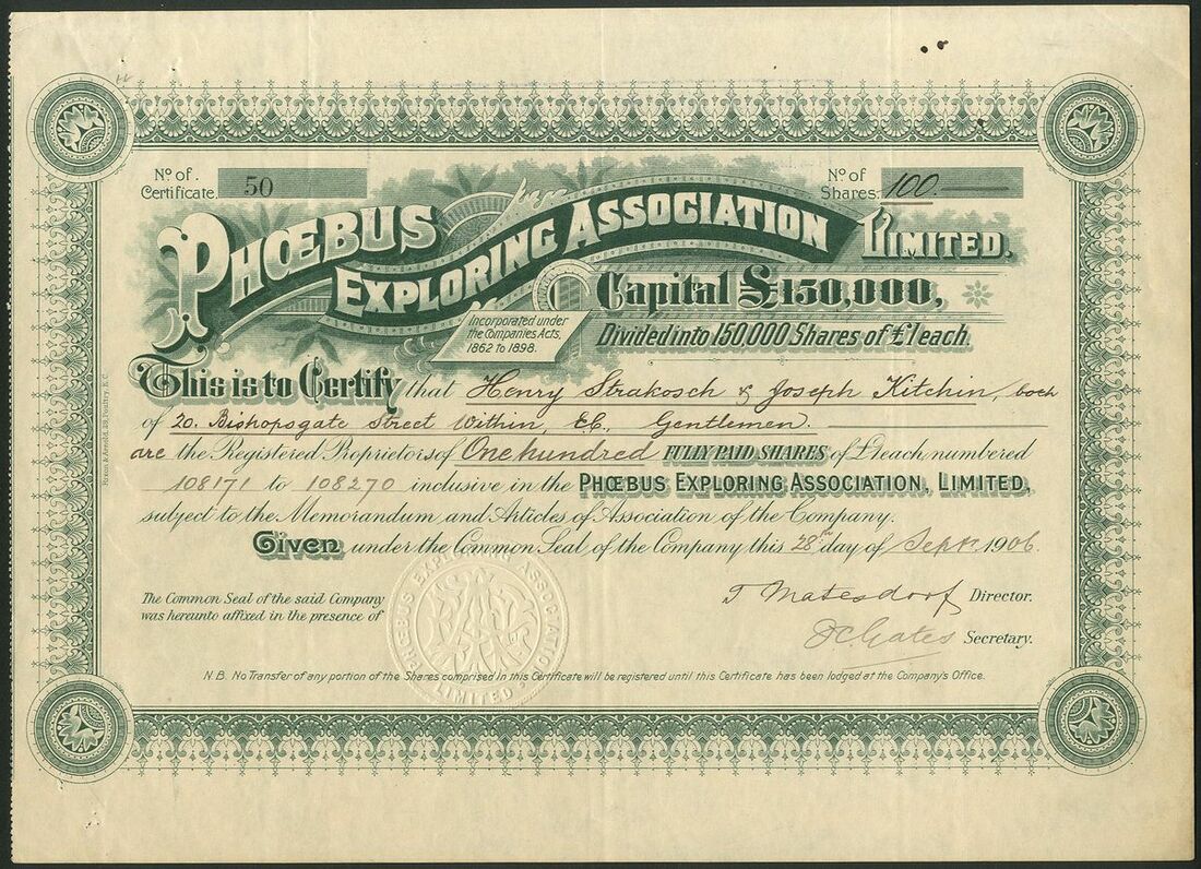 Germany: Phoebus Exploring Association Ltd., £1 shares, 19[06], #50, signed by Theodore Matesdorf as Chairman, ornate border, green. Formed to acquire Allegemeines Explorations Unternehmen GMBH, with Max Steinthal as director. Max Steinthal was a director of the Deutsche Bank. Matesdorf was involved in various mining ventures with the Rothschilds but best known as an artist. Died 1909. VF and rare.