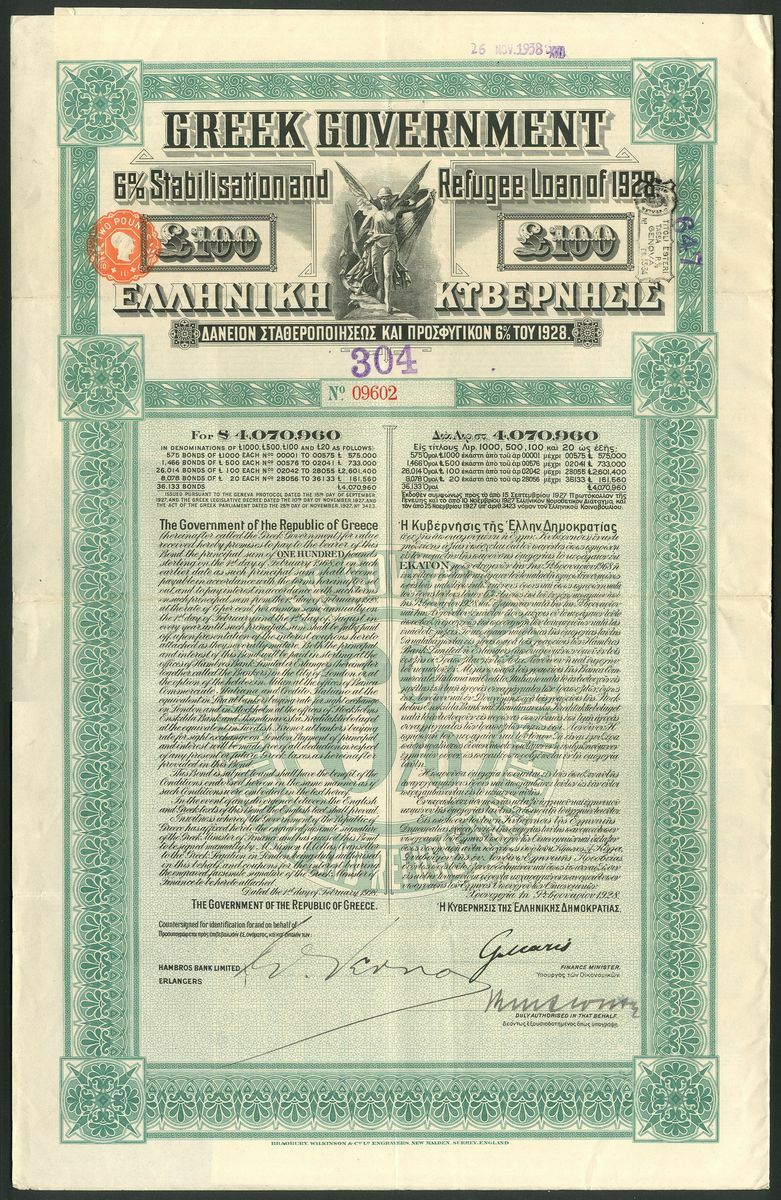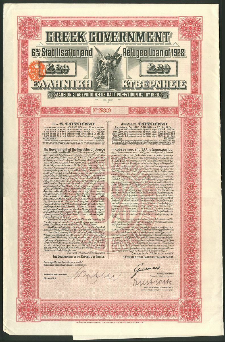 Greece: Greek Government 6% Stabilisation and Refugee Loan of 1928, pair of bonds for £20, #29809 and £100, #09602, large format bonds printed by Bradbury, Wilkinson & Co., vignette of Nike at top, ornate borders, red and green respectively, both with coupons. VF or better (2).