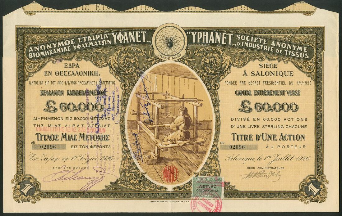 Greece: "Yphanet" Société Anonyme d'Industrie de Tissus, £1 share, Salonique 1926, no.02096, large vignette of woman weaving on loom in centre, ornate border, brown and black, text in Greek and French, with coupons, some hand annotation on face. GVF.