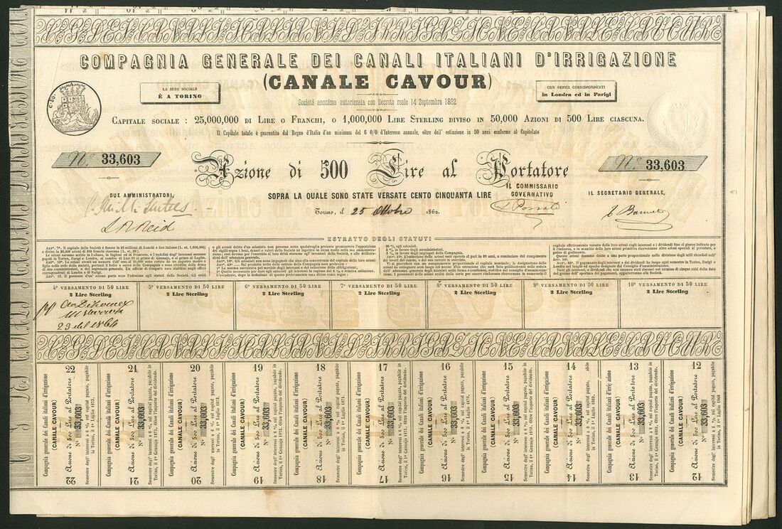 Italy: Canal Cavour - Compagnia Generale dei Canali Italiani d'Irrigazione, 500 lire share, 1862, 12 examples, attractive printing, black with yellow-brown underprint, with coupons. The canal was named after Count Camillo Benso di Cavour, prime minister of Piedmont, and was instigated to irrigate the dry areas of the State, mainly for rice production. It starts at Chivasso, taking water from the Po running 82 km to the Ticino at Galliate. A brilliant feat of engineering, the costs bankrupted the company in 1868 and has been managed by the State since 1874. Centre fold otherwise EF (12) NO RESERVE.