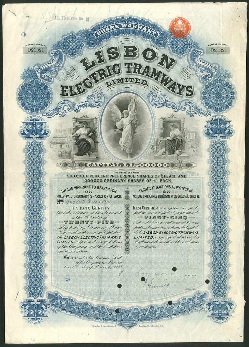 Portugal: Lisbon Electric Tramways Ltd., 25 ordinary shares of £1, London 19[28], D21321, capital £1,500,000, large format piece with allegorical figures in centre, ornate border, blue and black, printed by Waterlow & Sons, hole cancelled, with coupons. The first of the electric tramways in the city, built by this English company formed in 1899. The Company imported and operated tramcars from the USA. VF.