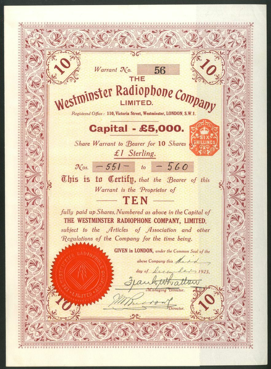 Great Britain: Westminster Radiophone Co. Ltd., bearer warrant for 10 shares of £1, 1923, ornate border, mauve, yellow underprint, red seal, with coupons. No details of this company are known at the moment but we know that it manufactured radio sets at this period. The term ´radiophone´ is also used to describe two-way radio sets which were being experimented with by police forces during this period. AEF.