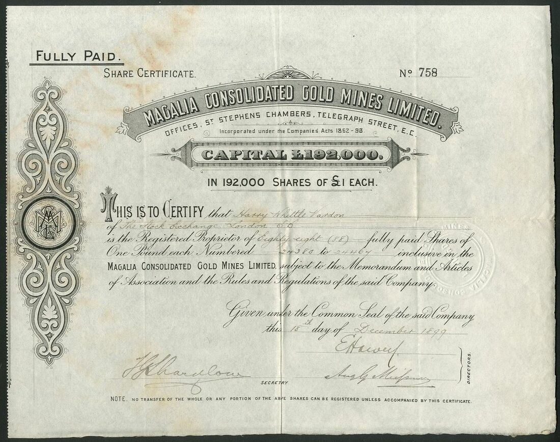 U.S.A: Magalia Consolidated Gold Mines Ltd., £1 shares, fully paid, [1899], #758, black. Registered in 1898 as third reconstruction of Golden Feather Channel Limited. Property in Butte County, California. Slight discolouration in places, VF.