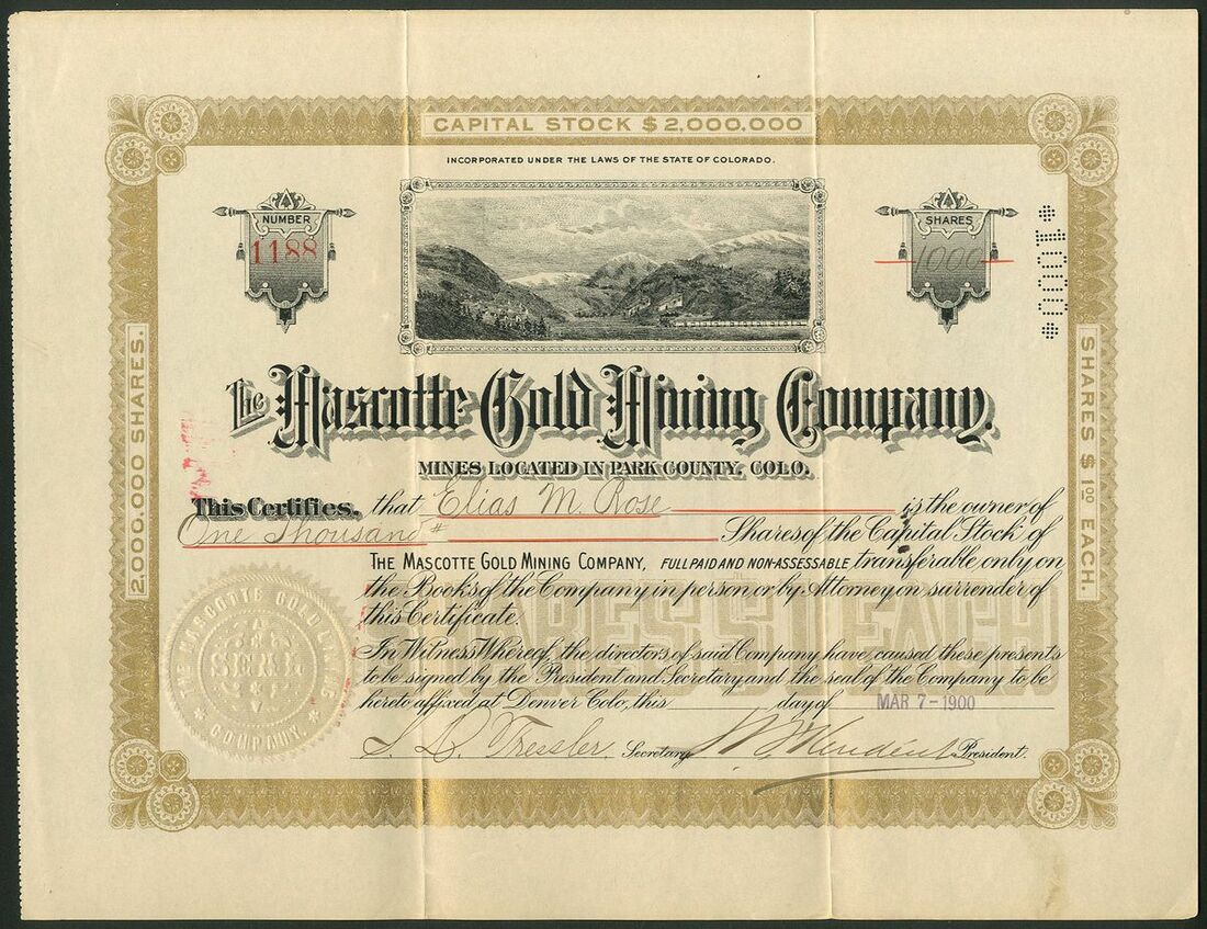 U.S.A: Mascotte Gold Mining Co., $1 shares, [1900], #1188, mountainscape at top, ornate border, black and gold. Mines in Park County, Colorado. GVF.