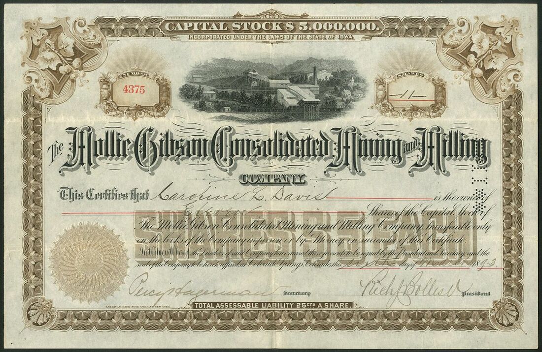 U.S.A: Mollie Gibson Consolidated Mining & Milling Co., $5 shares, 18[93], #4375, mine and mill site at top, ornate border, brown and black. A consolidation of the Mollie Gibson Mine with others in Pitkin County, Colorado. One of the largest silver strikes in the country at the time. GVF.