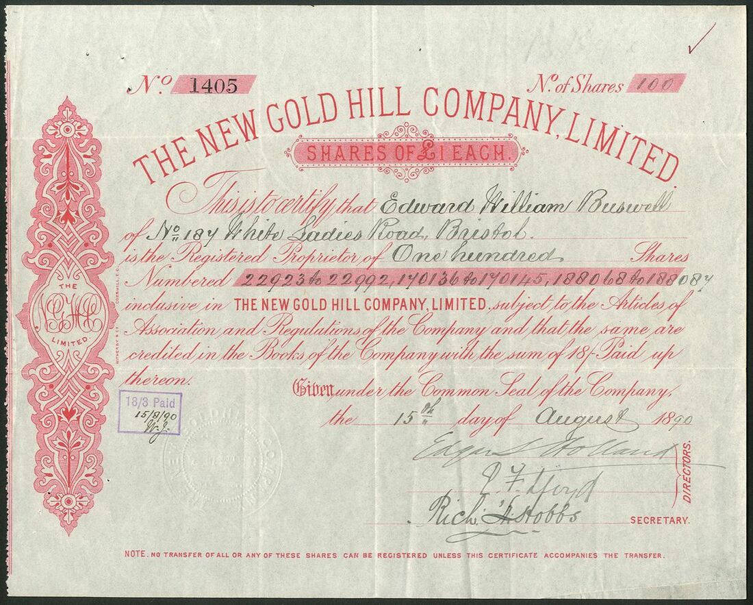 U.S.A: New Gold Hill Company Ltd., £1 shares, 18[90], #1405, red. Registered in 1888 to take over the property of the Gold Hill Mines Limited. Owned about 500 acres in North Carolina. VF.