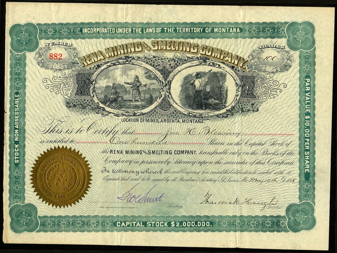 U.S.A.: Rena Mining and Smelting Company (MT), $10 shares, St. Louis, MO 188[8], #882, vignettes of native Americans and miner underground, green, brown and black. Mines at Argenta, Montana. VF.
