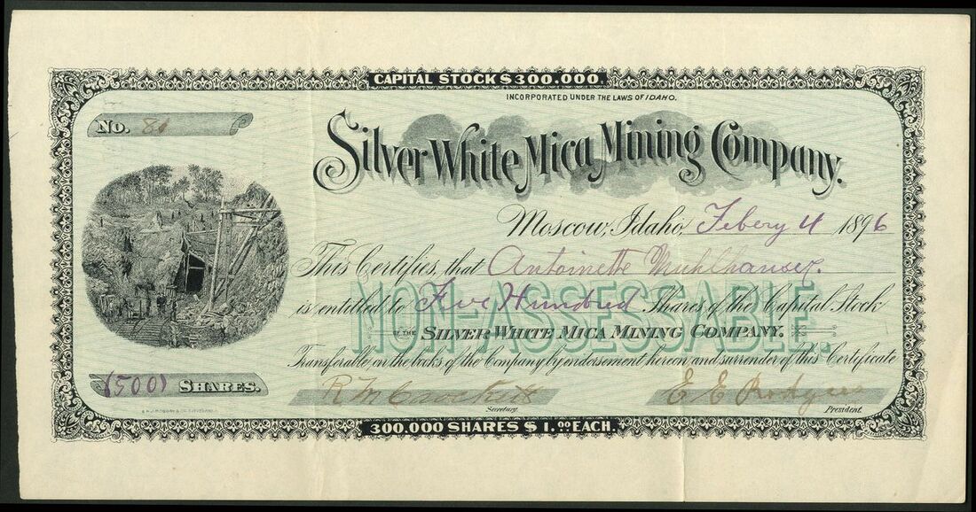 U.S.A: Silver White Mica Mining Co., $1 shares, 189[6], #81, mine entrance and workers at left, black with green underprint. Offices in Moscow, Idaho. AEF.