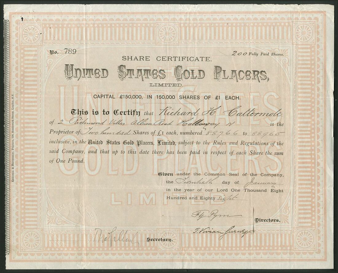 U.S.A.: United States Gold Placers Limited, £1 shares, 188[8], #789, attractive printing in black with pink underprint. Registered 1886 to acquire Cottonwood Placers, about 800 acres on the banks of the San Miguel River, Colorado. Reconstructed as United States Gold Placers (New Company) Limited in 1889. Newspaper reports of 1892 accuse the company of being a swindle following its bankruptcy in the same year. AVF and scarce.