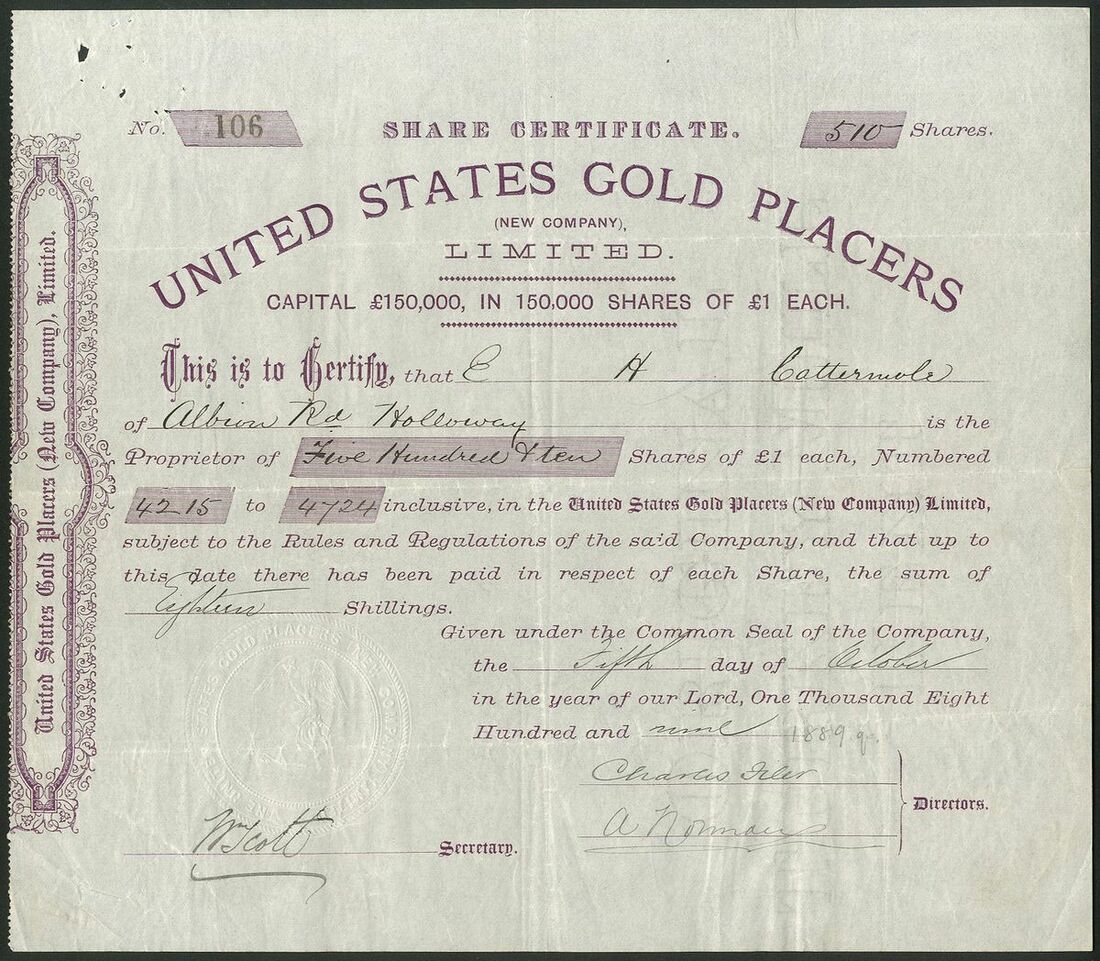 U.S.A.: United States Gold Placers (New Company) Limited, £1 shares, [1889], #106, mauve. Registered 1889 as a reconstruction of United States Gold Placers Limited which owned Cottonwood Placers, about 800 acres on the banks of the San Miguel River, Colorado. Newspaper reports of 1892 accuse the company of being a swindle following its bankruptcy in the same year. VF and scarce.