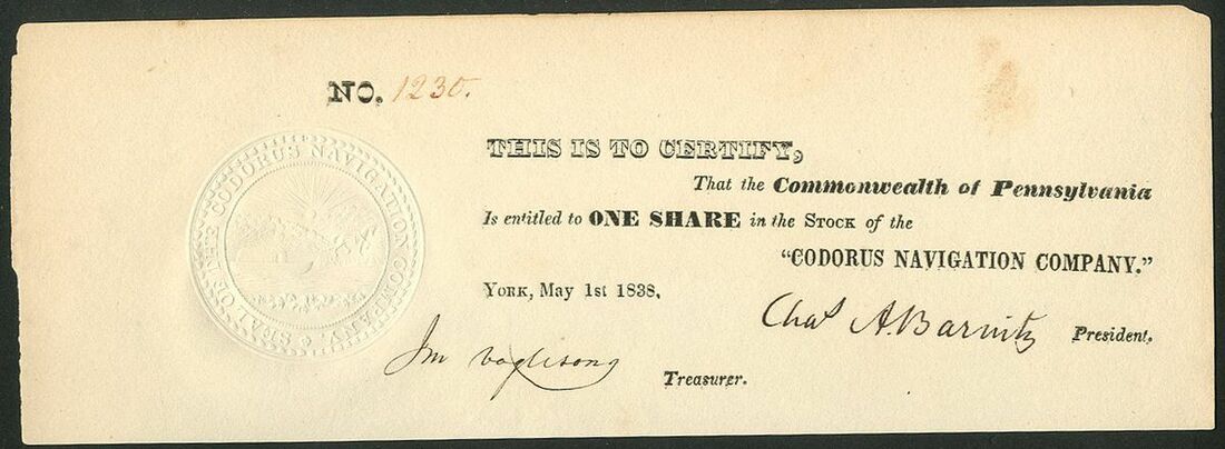 U.S.A.: Codorus Navigation Company, one share, York 1838, #1230, small format, black, attractive embossed seal. Formed in 1829 to to make Codorus Creek navigable from York, Pennsylvania to the Susquehanna River a distance of 11 miles. Like many canals, ceased to be profitable with the onset of railroads. EF.