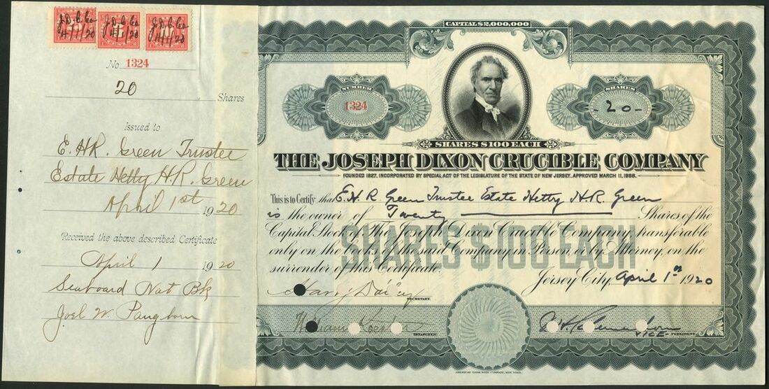 U.S.A.: Joseph Dixon Crucible Company, $100 shares, 19[20], #1324, issued to E.H.R. Green as trustee of the estate of Hetty Green and siged by him on the attached transfer document, vignete of Dixon at top, steel blue, counterfoil re-attached at left, cancelled. Hetty Green, known as the Witch of Wall Street was born into a wealthy whaling family in Boston but grew to fame as a miserly investor who amassed a fortune of between $100 and $200 million by the time of her death in 1916. Edward Howland Robinson Green, 1868-1936, also known as Colonel Green was the only son of Hetty Green and inherited half of her fortune, the other half going to his sister Harriet. He was a well known collector of both stamps and coins and was once owner of the sheet of 'inverted jenny' stamps which he later broke up. The Joseph Dixon Crucible Company, founded in 1827, grew to be the world's largest manufacturer of graphite products in the world. VF and rare.
