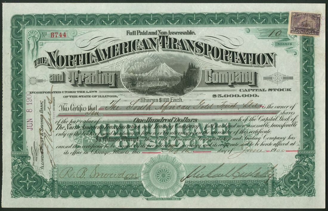 U.S.A.: North American Transportation and Trading Company, $100 Shares, Chicago 19[00], #B744, green, original signature of Michael Cudahy as President and issued to the South African Gold Trust Limited. Michael Cudahy (1841-1910) revolutionised the meat industry by using refrigeration in meatpacking and preservation so that this business, that was until then limited to the winter months, could now be operated continuously throughout the whole year. After selling his business, he invested in other companies where again he showed his talent for profitable investments. His North American Transportation and Trading Company was a pioneer in steamboat transportation on the Alaskan river Yukon, where it operated a fleet of 15 ships. When the Klondike Gold Rush broke out, the company was in the quasi-monopolistic situation. Not only able to provide prompt and rapid transport from Seattle to Dawson, the centre of the gold rush, but, even more profitably, it was able to sell the passengers the needed supplies. At the end of the Gold Rush, Cudahy sold his company to Northern Navigation Co. EF.