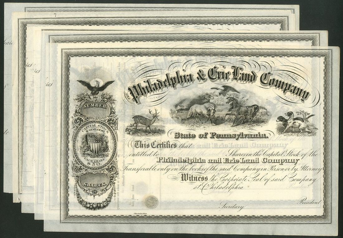 U.S.A.: Philadelphia & Erie Land Company, a group of 5 x unissued share certificates, 1860's, attractive vignettes, black. EF.