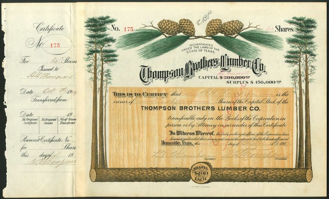 U.S.A.: Thompson Brothers Lumber Company, Texas, $100 shares, 190[9], #175, issued to H.H.Thompson and signed by him on the reverse, also signed by his brother J.L.Thompson as President, unusual design with pine trees and pine cones, green and brown, cancelled with stub attached at left. The origins of the business were in 1852 but grew over the years until the company owned nearly 150,000 acres of land and large mills at Willard, Doucette and Grayburg. The company was later closed with lumber interests being passed to other companies and the Thompsons concentrated on land and mineral investments. EF. NO RESERVE.