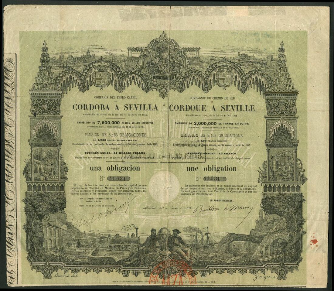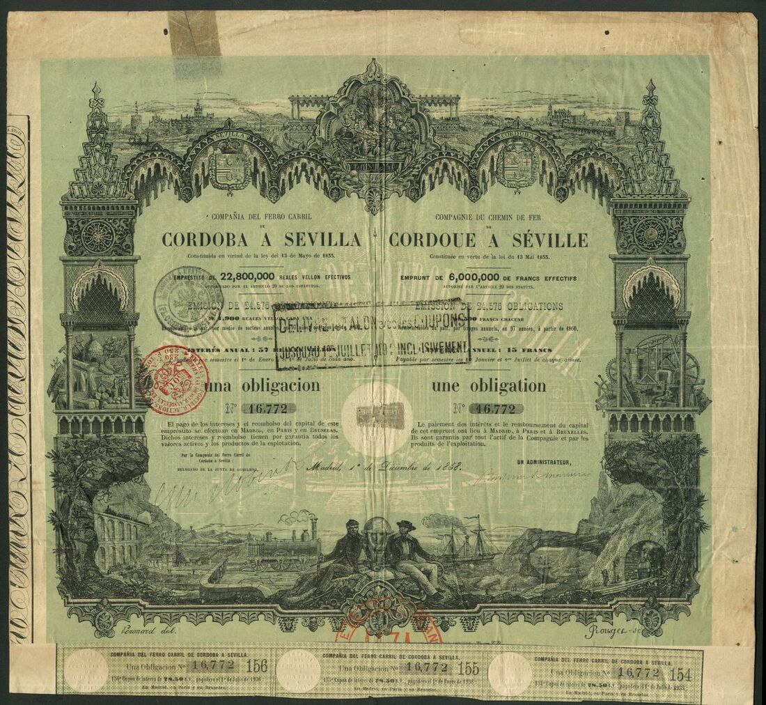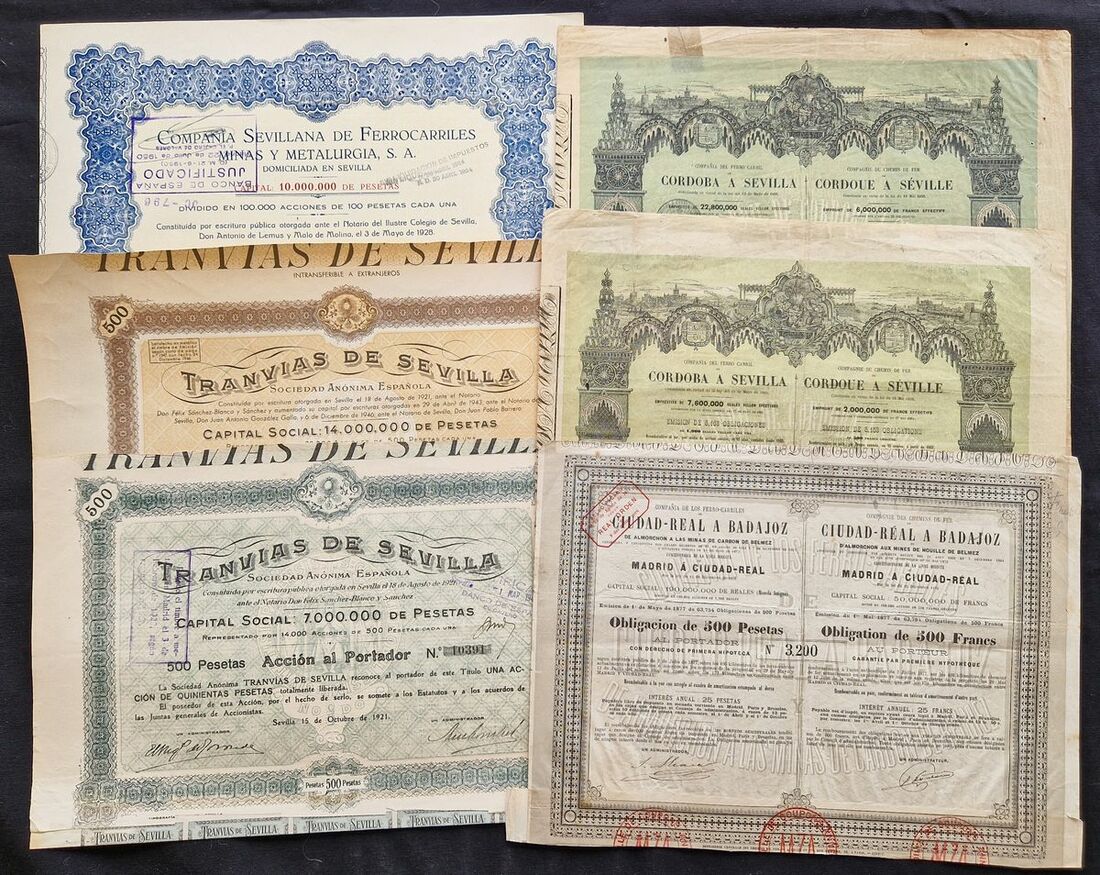 Spain: Railways and Tramways in South Western Spain, comprising Ferro-Carriles de Cuidad-Real a Badajoz, 500 peseta bond, 1876; Ferro Carril de Cordoba a Sevilla, 1900 reales bond, 1858, and another 1862; Tranvias de Sevilla, 500 peseta share, 1921 and another 1946, and, Compañia Sevillana de Ferrocarriles Minas y Metalurgia, 100 peseta share, 1928. Mixed condition, the early pieces only fine, the others VF and better (6).