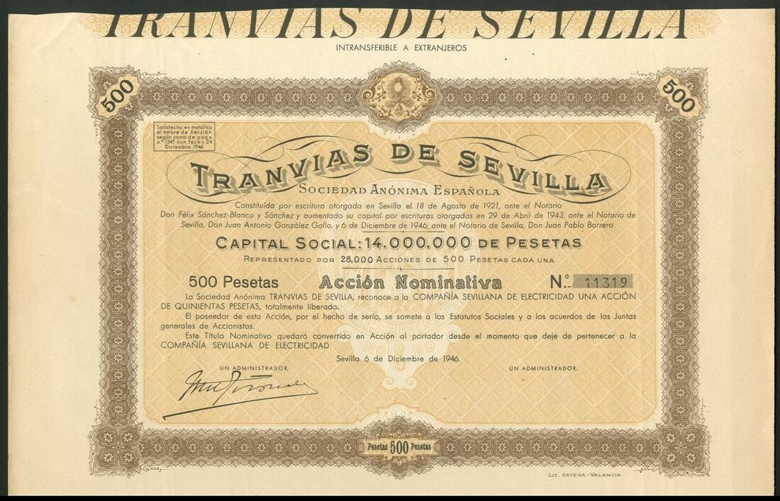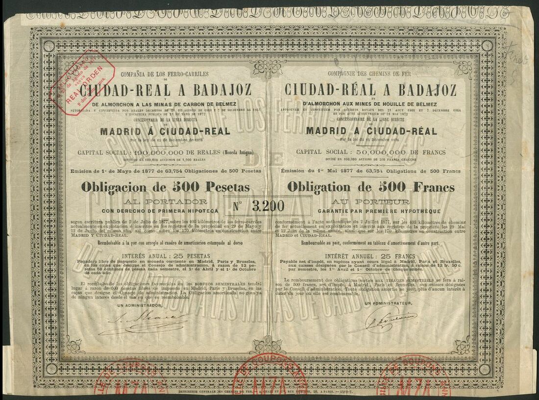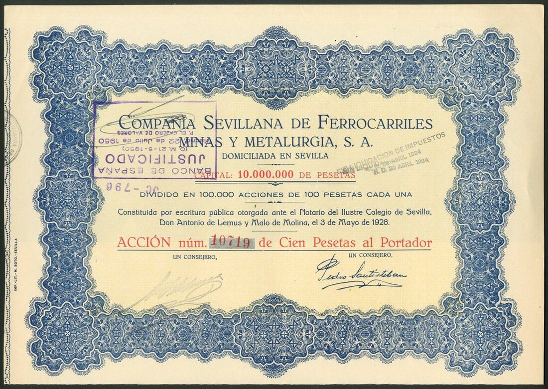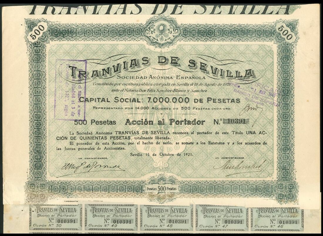 Spain: Railways and Tramways in South Western Spain, comprising Ferro-Carriles de Cuidad-Real a Badajoz, 500 peseta bond, 1876; Ferro Carril de Cordoba a Sevilla, 1900 reales bond, 1858, and another 1862; Tranvias de Sevilla, 500 peseta share, 1921 and another 1946, and, Compañia Sevillana de Ferrocarriles Minas y Metalurgia, 100 peseta share, 1928. Mixed condition, the early pieces only fine, the others VF and better (6).