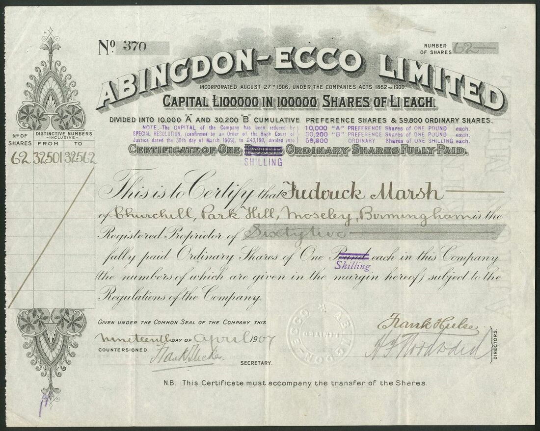 Great Britain: Abingdon-Ecco Ltd., £1 ordinary shares, overprinted 1 shilling, 19[07], #370, black. Registered to amalgamate two companies in the armament & cycle industry and extended their activities to motor cycles and a range of motor cars from 1902. Situated at Tyseley, Birmingham, the company changed its name to Abingdon Works Limited. In 1919. Motor cycles were produced until 1925 and motor cars until 1923. VF.