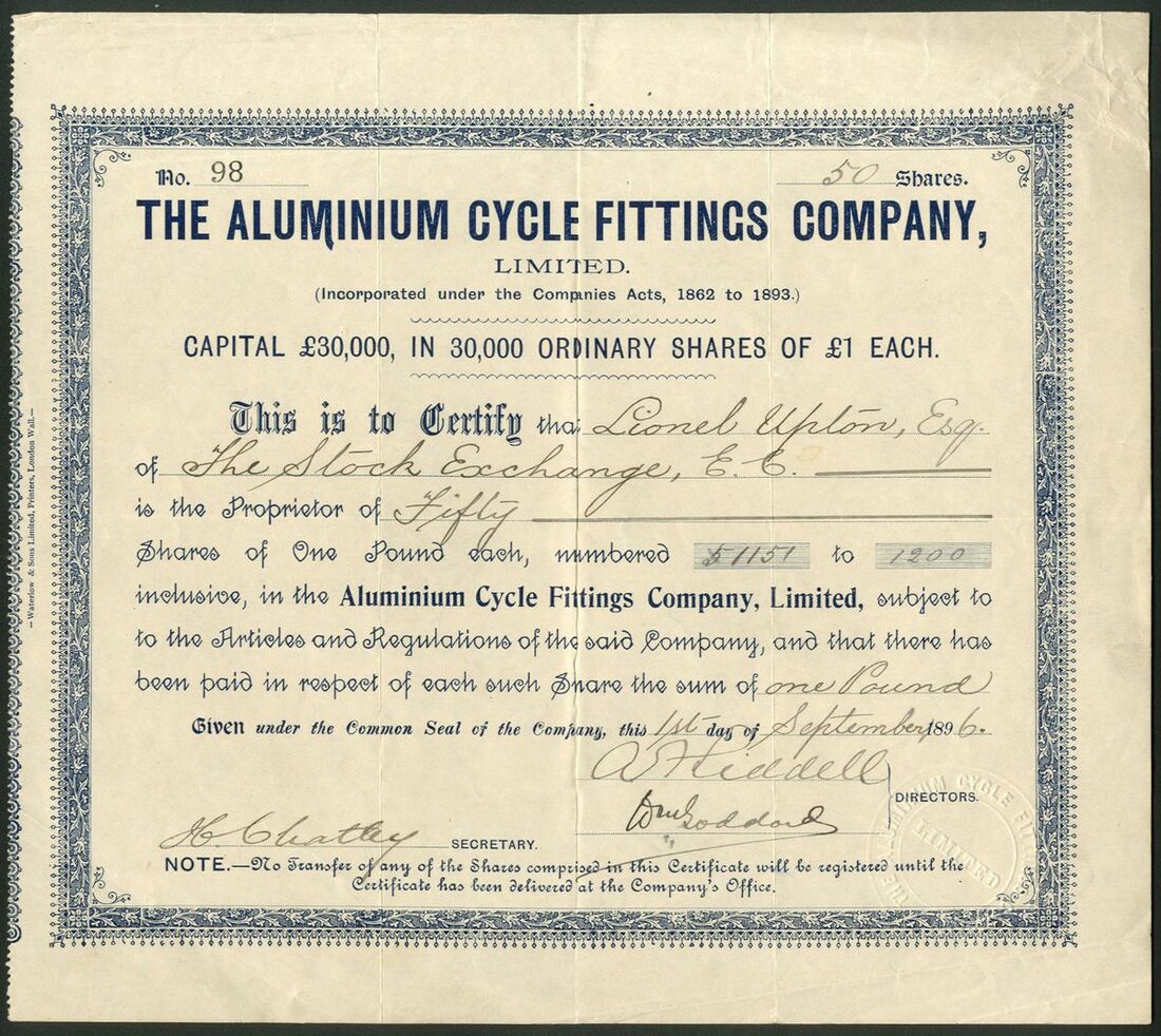 Great Britain: Aluminium Cycle Fittings Company Limited, £1 shares, 189[6], #98, blue, printed by Waterlow & Sons. Coventry based maker of mudguards, gear cases and light fittings for the cycle trade. Voluntary liquidation in 1897. VF.