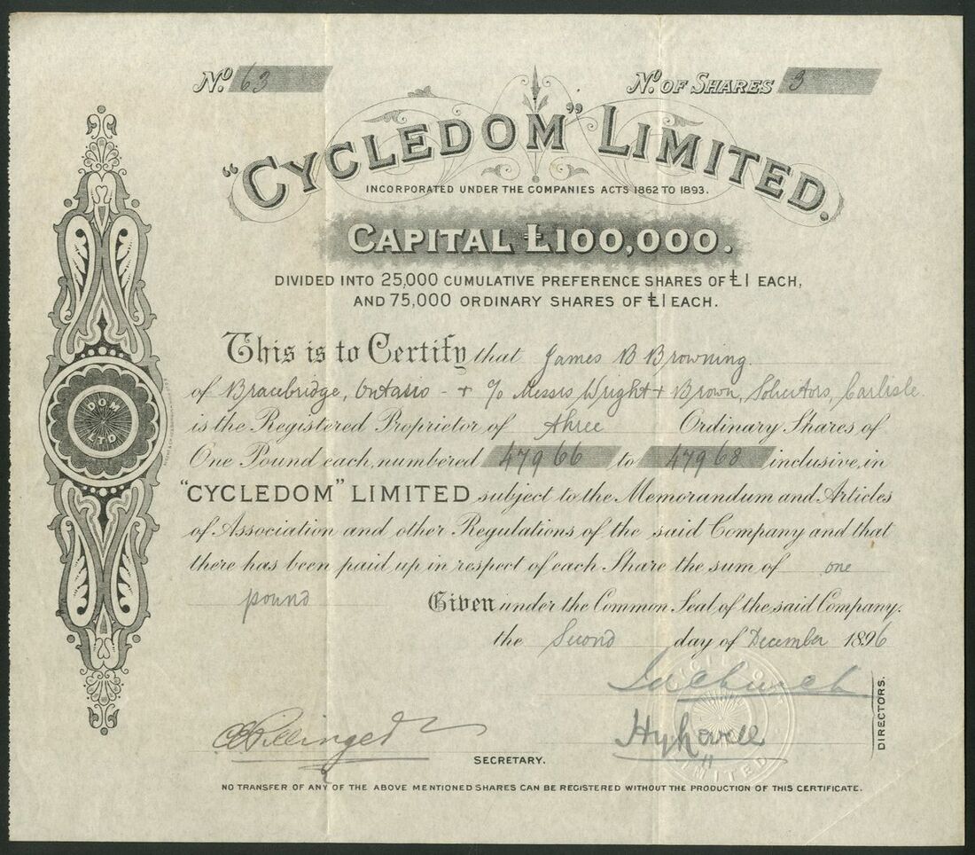 Great Britain: Cycledom Limited, £1 ordinary shares, 189[6], #63, black. Registered in 1896 to acquired the business of E. Lovell of Blackfriars and Chelsea, London, cycle manufacturers and dealers which had been going for 15 years. Shareholders in the new company were to be offered advantageous discounts for any purchases. In liquidation in 1908. VF and rare.