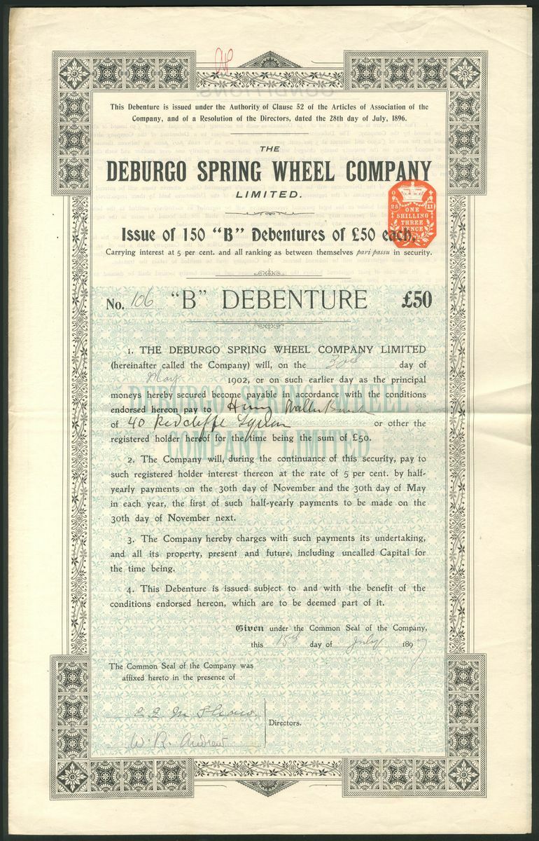 Great Britain: Deburgo Spring Wheel Company Ltd., "B" debenture for £50, 189[7], #106, of only 150 issued, large format, black with blue underprint, 4 pages. Registered in February 1895 to purchase patent rights for spring hubs for wheels granted to Dr. Burke and to manufacture cycles at a factory in Bavington Road, Paddington, London. In liquidation in 1897. VF.
