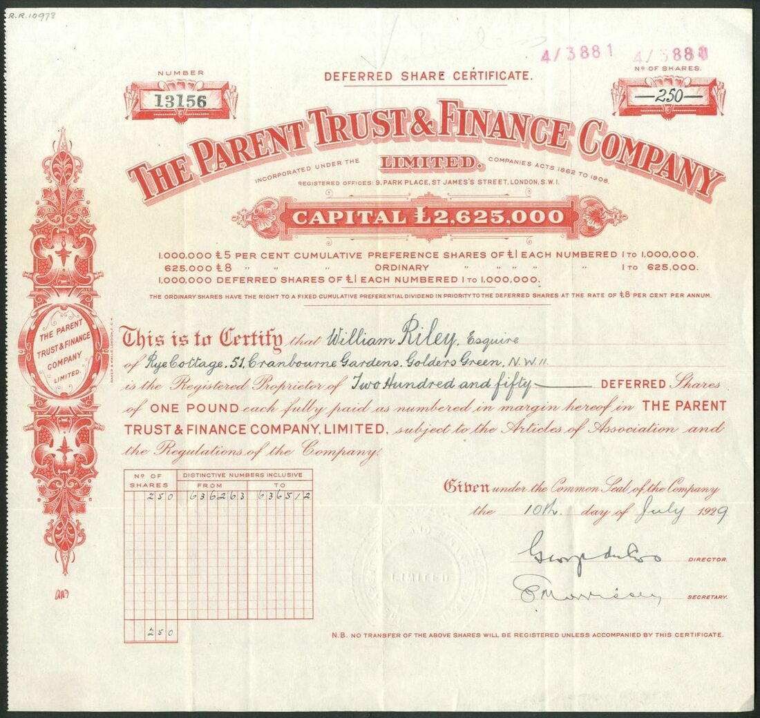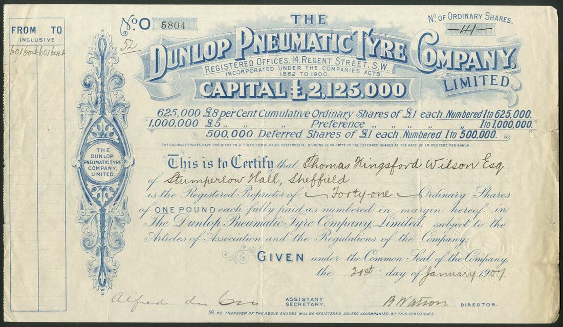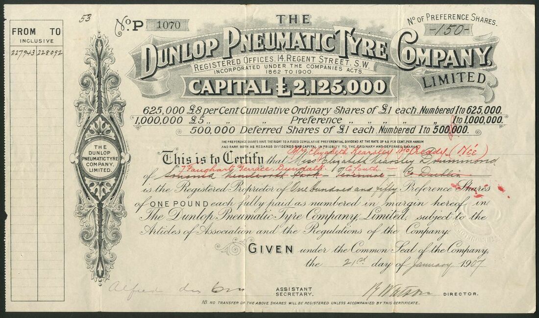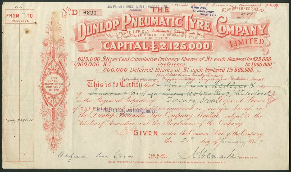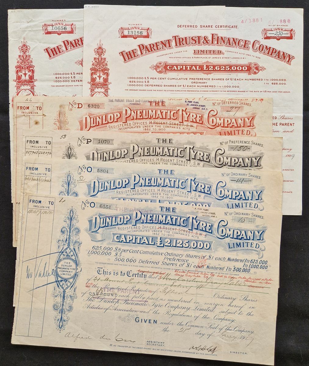 Great Britain: Dunlop Pneumatic Tyre Co. Ltd., a collection of certificates all signed by Alfred du Cros as secretary, comprising ordinary shares, 19[07], #5804 and another with company title overprinted, #6551; preference shares, 19[07], #1070 and deferred shares, 19[07], #6320. Together with 2 examples of Parent Trust & Finance Company 192[5] and 192[9]. Dunlop was formed in 1896 and changed its name in 1913 to the Parent Pneumatic Tyre Co. and in 1925 to the Parent Trust & Finance Co., and at all times the du Cros family was at its head, led by William Harvey and his third son Sir Arthur Philip. With the crash of Clarence Hatry's companies in 1929, in which Sir Arthur invested heavily, the Parent Trust & Finance faced losses of over £3m. A court order was given to wind the company up in 1932. Generally VF (5).