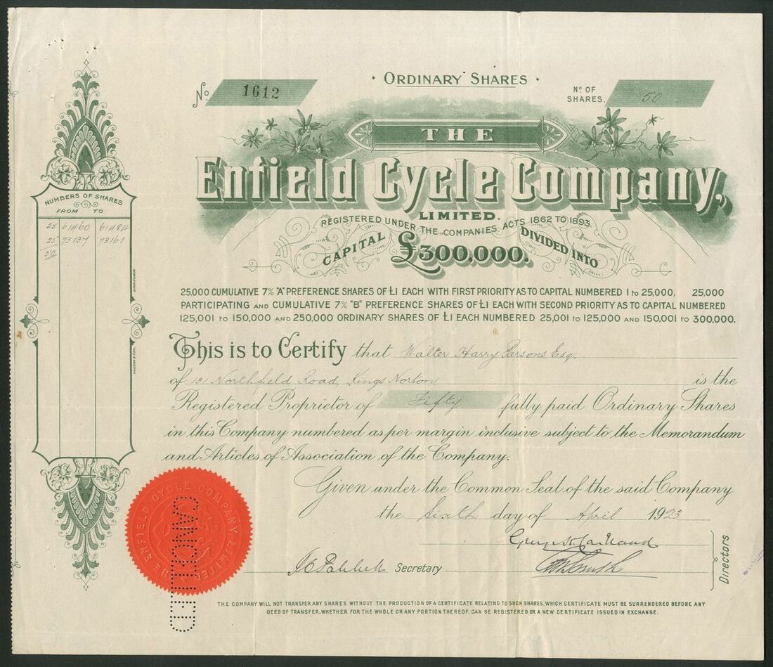 Great Britain: Enfield Cycle Co. Ltd., £1 ordinary shares, 19[23], #1612, green, red seal, punch perforated