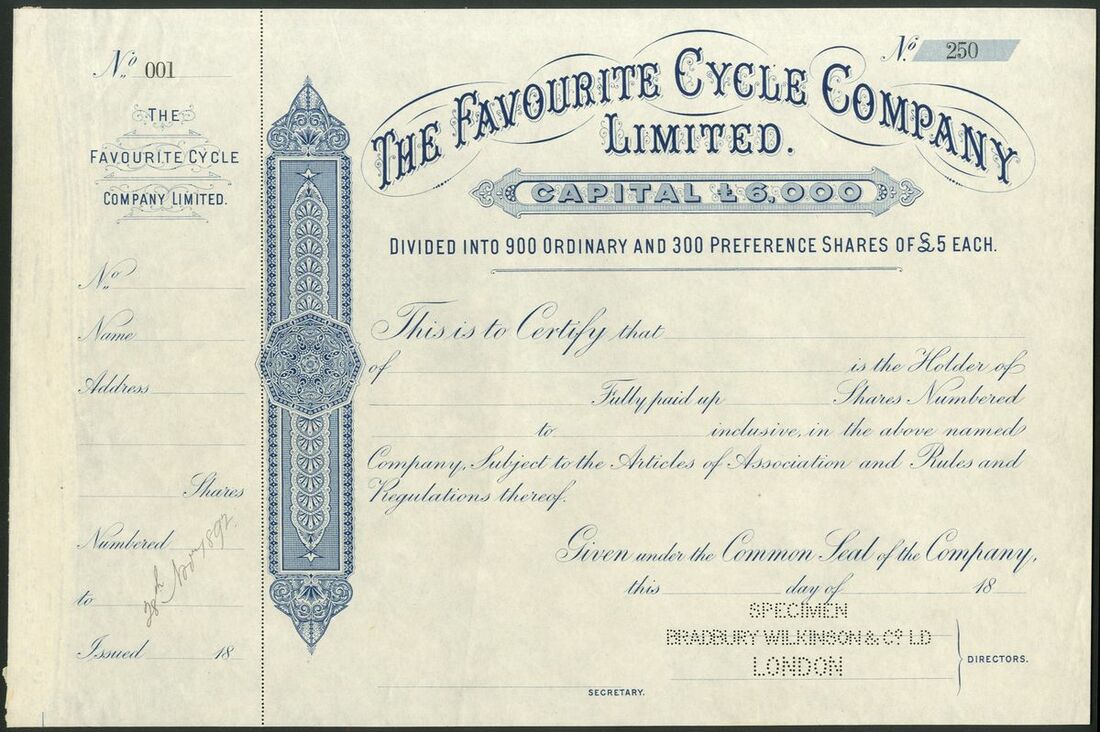 Great Britain: Favourite Cycle Company Limited, a specimen certificate for £5 shares from the Bradbury, Wilkinson & Co. archives, 18- (circa 1892), blue, with counterfoil. perforated SPECIMEN. Registered 3rd November 1892 to acquire the business of Messrs Judd, Lindsay & Co. of London. EF and rare.