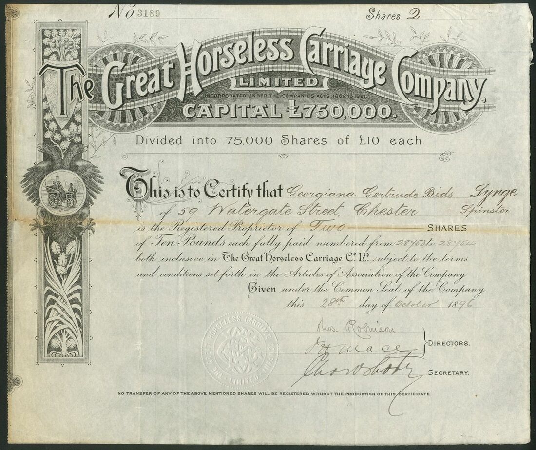 Great Britain: Great Horseless Carriage Company Limited, £10 shares, 18[96], #3189, small motor car with double headed eagle at left, black. Registered in 1896 by Harry J. Lawson who had acquired Daimler patents and promoted by the notorious E.T.Hooley. Reorganised as the Motor Manufacturing Company Limited in 1898. With related paperwork. AVF and rare.