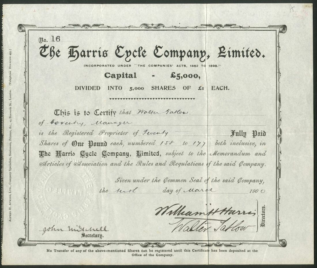 Great Britain: Harris Cycle Company Ltd., £1 shares, 190[0], #16, black. Registered in 1900. Cycle manufacturer at the Hill Cross Works, Coventry which were previously the premises of Hotchkiss. Lasted at least to the outbreak of WWI. VF and scarce.