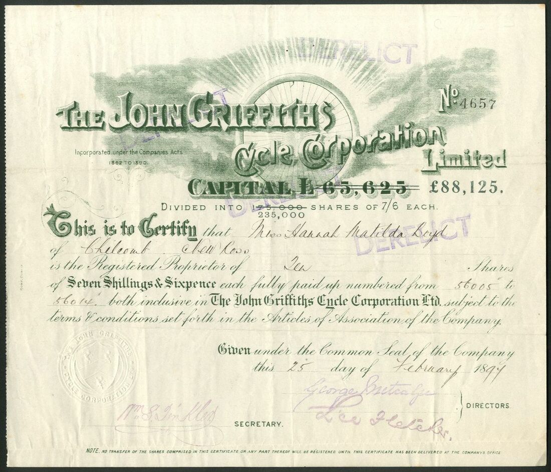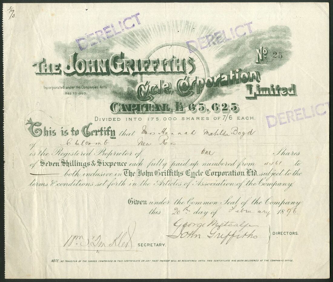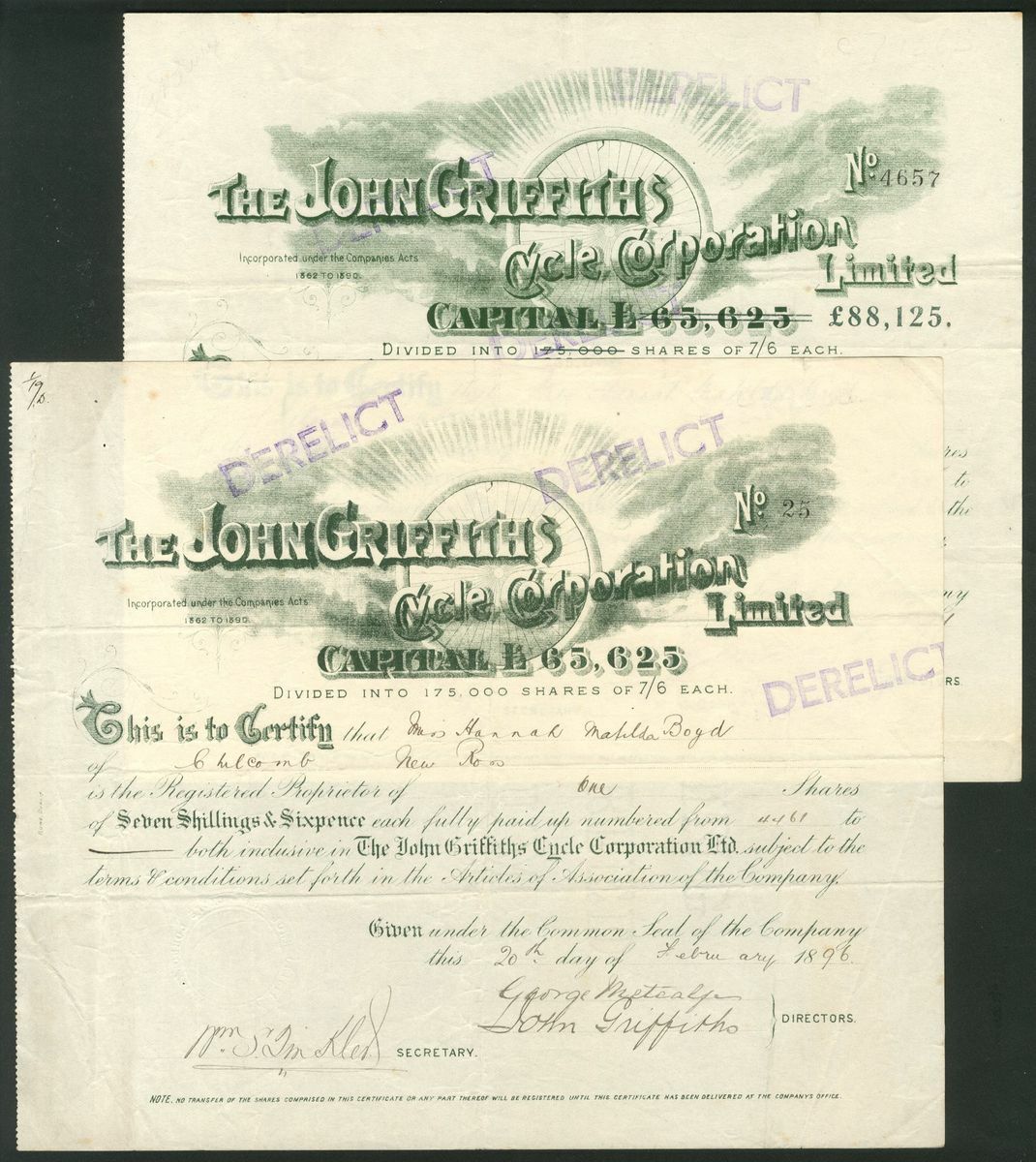 Great Britain: John Griffiths Cycle Corporation Limited, pair of certificates for 7/6d shares, 18[96], #25, and 18[97], #4657, with capital overprinted, cycle wheel in underprint behind title, stamped DERELICT. Registered in November 1893 to acquire many cycle agencies in England and especially Ireland. VF (2).