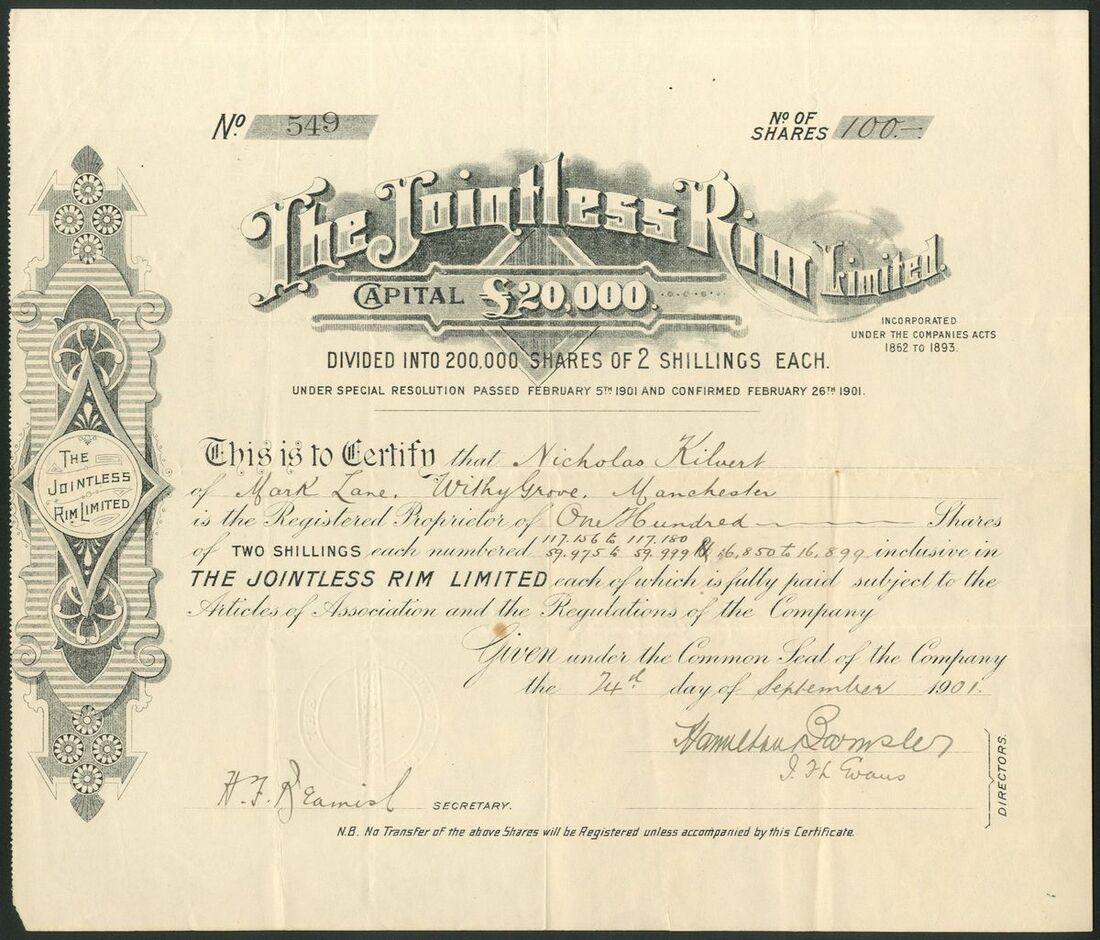 Great Britain: Jointless Rim Limited, 2/- shares, 19[01], #549, black. Originally registered as the New Jointless Rim Limited in 1898 to acquire the business of the Jointless Rim Ltd., formed in 1893. 'New' was dropped from the name by special resolution in 1901. Worked a patent for producing metallic rims for cycle and motor wheels and to acquire a licence from Dunlop to operate the Westwood rim patents. Leased the Arrol Works, Aston, Birmingham. In liquidation 1906. VF.
