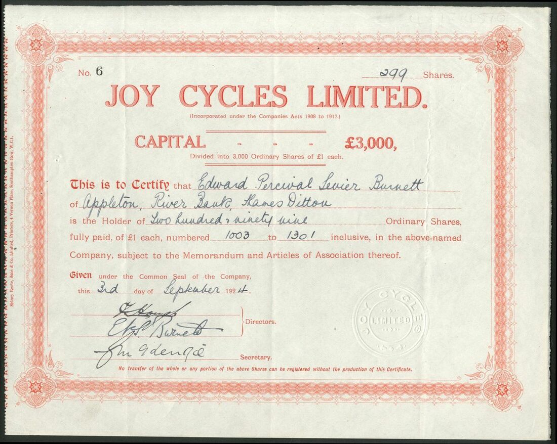 Great Britain: Joy Cycles Limited, £1 shares, 192[4], #6, red. Registered 1924. Manufactured childrens cycles from their Joyland Works in Fleet Street, Coventry. In liquidation in 1926. VF.