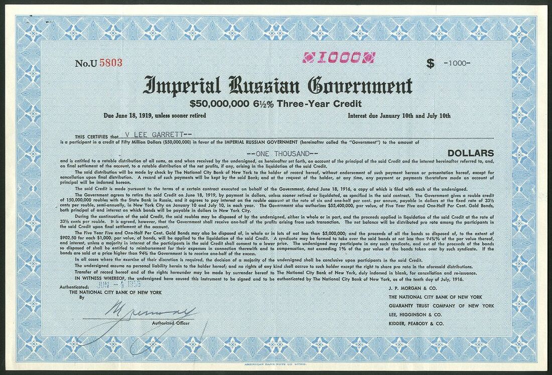 (x) Imperial Russian Government, 6½% Three Year Credit, 1916, certificate for $[1000], dated [1956], #U5803, blue and black, printed by the American Bank Note Co. This loan was issued in both bearer and registered form, however all certificates issued after 1919, when the loan should have been repaid, are issued in registered form. All Russian loans were repudiated after the revolution but many continued to be quoted on many stock exchanges in both Europe and the USA. This was one of very few dollar denominated loans issued by the Russian Government. VF and scarce.