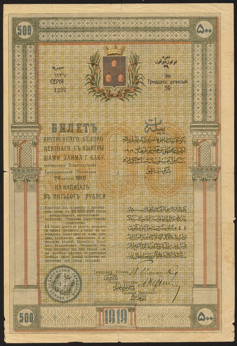 Russia/Azerbaijan: City of Baku, 4% Loan, 1919, bond for 500 roubles, series 1237 #39, city arms at top, multicoloured border with considerable eastern influence, lacks coupons. Issued during the Civil Wars that developed after the October Revolution, lacks coupons. Small edge splits, F-VF and scarce.