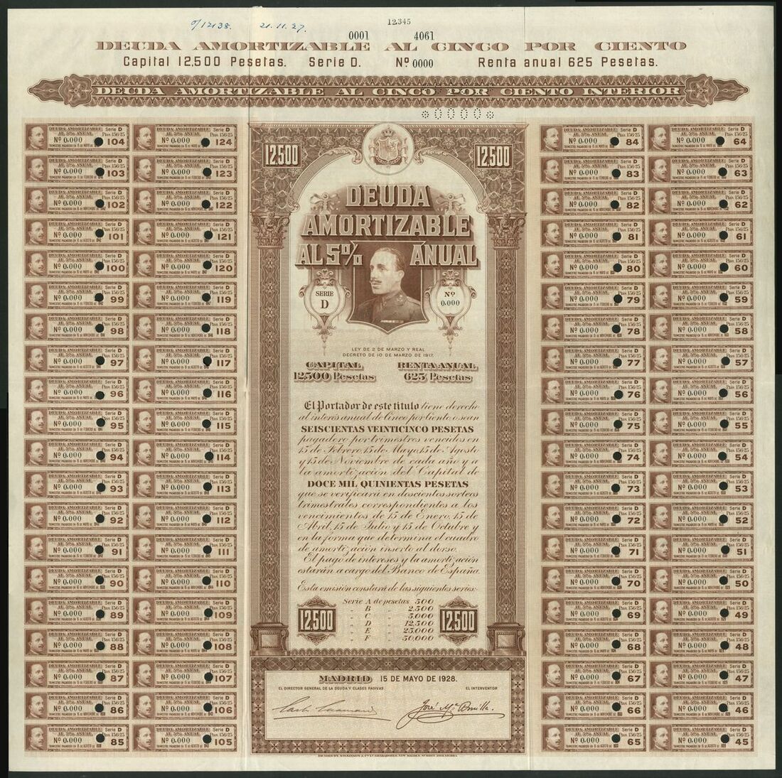 Spain: Government, 5% Internal Loan, a specimen bond for 12,500 pesetas, from the Bradbury, Wilkinson & Co. archive, series D, Madrid 1928, large format piece with ornate borders, black and brown, vignette of King Alfonso XIII, three quarters face, in military uniform at top, coupons either side, small hole cancels. GVF and very rare top denomination [R12*].