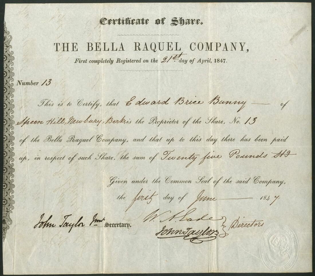 Spain: Bella Raquel Company, one share, 184[7], #13, signed by John Taylor as director, and John Taylor Junior as secretary, scrollwork at left, black printing, embossed seal depicting 'Bella Raquel' bottom right. Following the discovery of silver in the Province of Guadalahara, John Taylor & Sons formed this company to work the deposits. John Taylor jr., 1808-1881, eldest son of John Taylor, admitted to the partnership in 1845 and was instrumental in creating British investment in mining in Spain. John Taylor senior was one of the most influential mining engineers of the early 19th century working in Cornwall & Devon, Wales and in Cumbria. Apart from Spain, overseas ventures included British financed companies in the California Gold Rush and many locations in South America. VF.