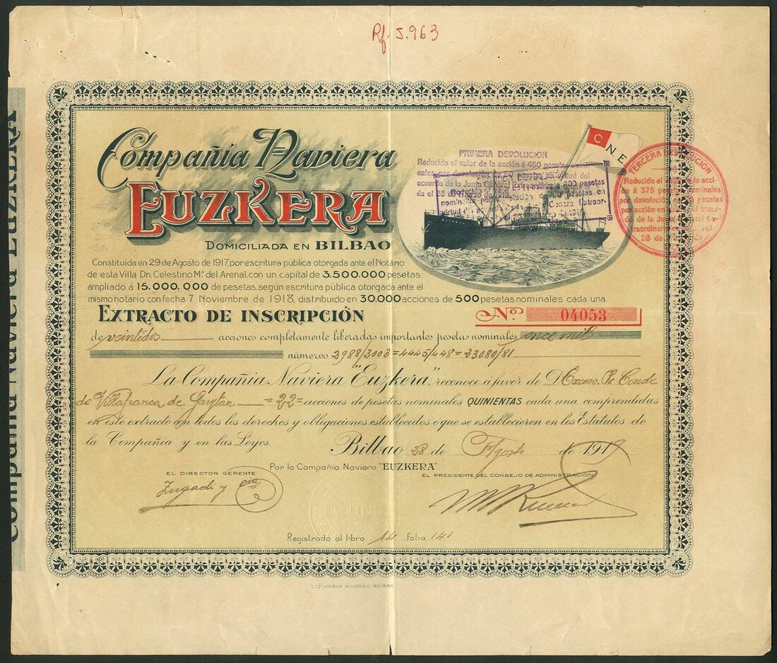 Spain: Compañia Naviera Euzkera, 500 peseta shares, Bilbao 191[9], #04053, vignette of steamship, dark blue and red with yellow underprint. VF.