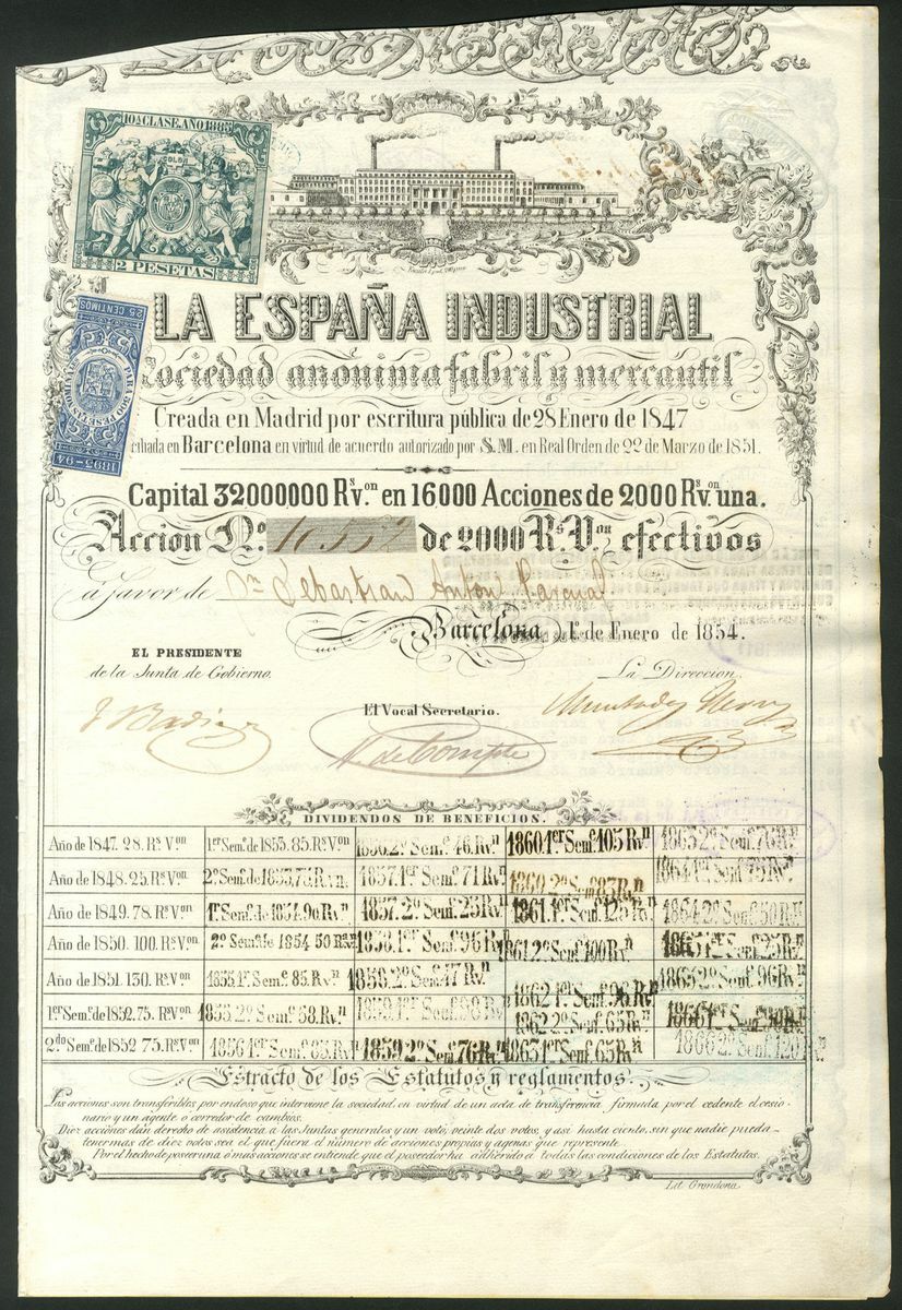 (x) Spain: La España Industrial , Sociedad Anónima Fabril y Mercantil, a group of 13 certificates for 2000 reales vellon shares, 1854 and another for 500 peseta share, 1931, all of the same design with large cotton mill at top, black, 4 pages. This was the first joint stock cotton company formed in 1847 and at ts height in the 1880's had a workforce of some 2500 men, women and children. Finally closed in 1981. Generally VF-EF (14).